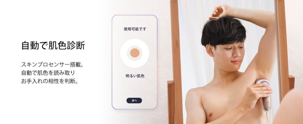 機能的価値: 毎秒80回、肌の色をスキャンし、1照射ごとに10段階のパワーレベルを自動で調整する [1, 2]。同じ腕でも、内側と外側では肌の色が微妙に違う。VIOのようなデリケートな部位は、特に色素が濃い傾向にある。このセンサーは、そうした微細な色の違いを瞬時に検知し、火傷のリスクを抑えながら、常に安全かつ効果的な照射を自動で実現する。
